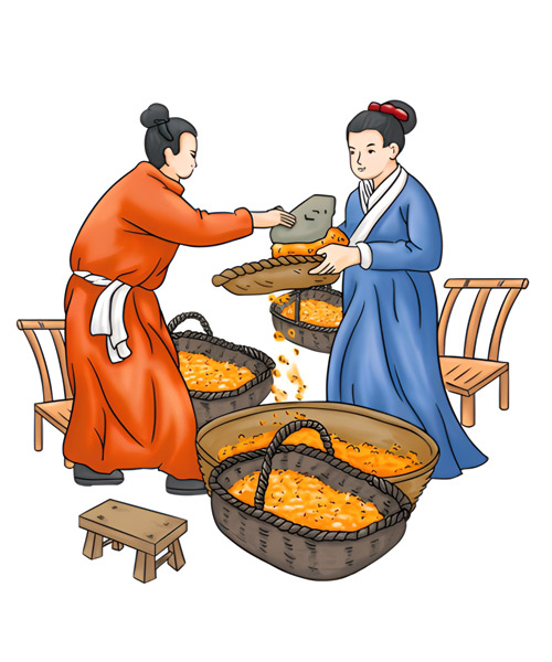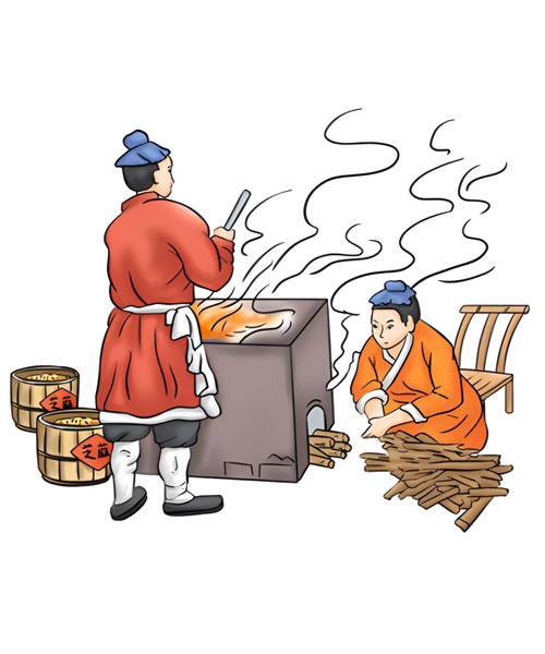 - 漂洗后的芝麻,以鐵鍋碳火慢炒至香味溢出。其中炒芝麻的手法、火候及加料工藝等,都以獨特的秘訣形式由師徒間代代傳承。
